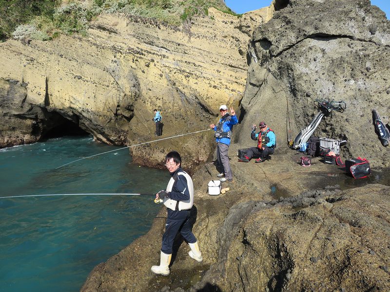 いやいや風も収まらず、波も大きく・・・ でもいろんな知り合いの方々が次々と来ていただいた。 まだまだ高水温のこの時期、相変わらずシマアジも多い。 だがそれも撒き餌ワークやアワセかたで釣果も違ってくる。 Tさんグループと偶然Mさんグループも途中参加の磯だった。