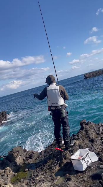 竿をすかさず取り上げる予定だったが引きずられながら取り切れず、一段下の磯まで魚に落とされた。