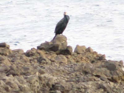 磯にたたずむウミウ君、30分以上かなり長い間たたずんでいた。 100mは離れているが、画像に残しておこうと。 獲物は海の中だろうが、なかなか潜ろうとしないのは、、、なぜ? 小サバ・イワシの雰囲気を磯から探っているのだろうが、じっと粘りと辛抱が続く。 そのうち私の視線に気づいたのか 「何見てんだよ」といった感じで目線を向けてくれた^^
