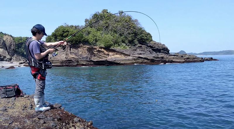 天気は良いが暑かった。 余裕で竿を曲げてすでに浮かせる状態の画像。 だが物は45cmほどのサンノジだった。