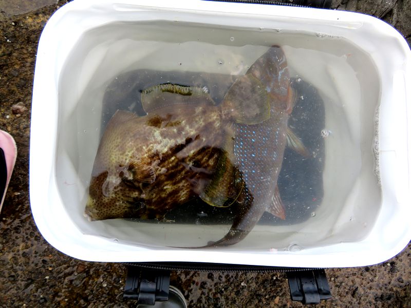 昼前から実釣だったが、上り潮がきつく次第に当て潮。 際狙いで探ってみてもサッパリの結果だった。 向かいの磯のTさん家族も様子を聞くと相変わらずといったところ。 夕刻4時台から当て潮もやや緩くなったころに37pほどのフエフキがきた。 続けて良型のカワハギも。 そして二人でフエフキを3枚。 潮の変わり目の時合いは貴重ですね。 大型であろうバラシも1回。 フエフキダイが来るようになるとそろそろ良い季節ですね・・・良型のシブダイも狙えます^^ レポート 金田