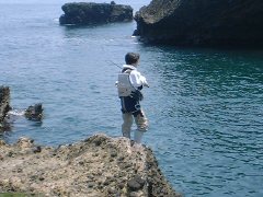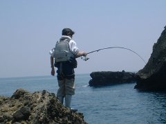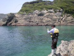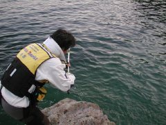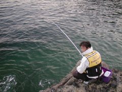 何でもええけど、腕もだるいし、心もなえる。 その後、5回目のバラシチャンスがあったが、なんとか取り込んだのは40cm弱の良型イサキで終了。 今年初めての地磯でのイサキであったことをお知らせします。 萩田氏もイサキを2枚追加して終了。 二人して「お疲れさんでしたぁ」