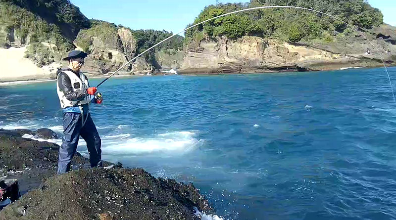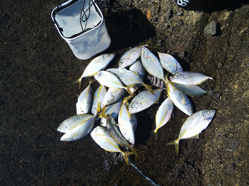 天気は晴れだがナライの風が強かった。 初心者の方にとって向かい風の中の磯竿はなかなか厳しいものが・ ・・ しばし裏の追い風の中で竿・リール・ ラインなどに慣れて頂くことに。 向かい風のウネリの波が上がってくる中でようやくシマアジか寄っ てきた。 Tさんもすでにこの地域では常連の方。 25センチ弱のシマアジの引きを楽しまれていた。