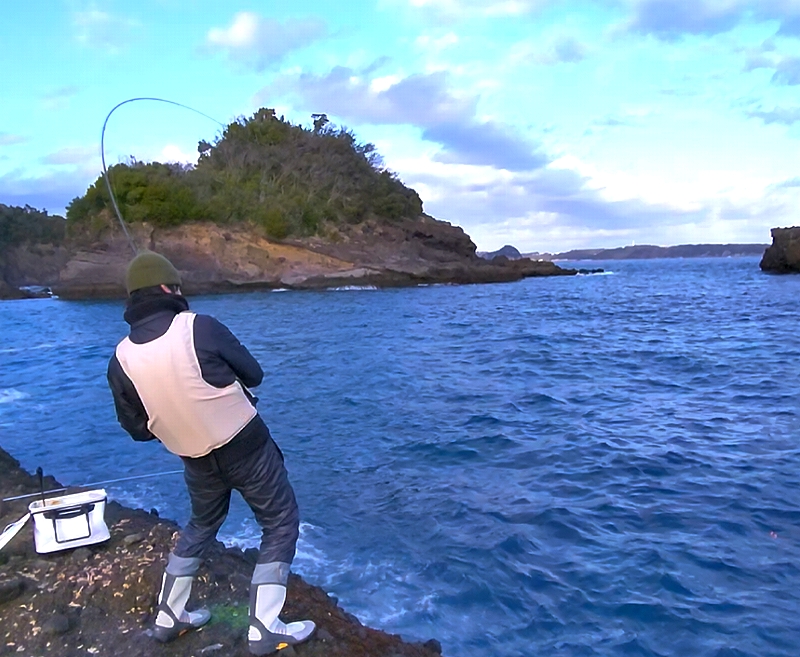 近くで見ていても竿のしなりで大物だとわかる それを体全身で耐える姿は頼もしい限り 初めての磯釣りであるMさんだが、釣り自体幼少の頃にされただけなのに・・・釣りのセンスは十分と思われます この魚も50cmオーバーのイスズミだけに、初体験でこのパワーを体感されたのは一生のかもしれない