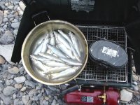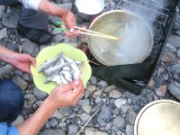 Aダシが出て、 アユがたけたら、 いったん鍋から出します。