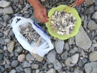 釣れたアユを洗います。 腹をしごいて糞をしぼり出しておきます。
