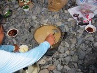 C炊き上がったら味噌で味をつけます。 卵をほぐして入れます。 なすびや、たまねぎ などを入れる方はどうぞご自由に