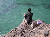 ている。受講者が撒き餌を入れる毎に海面が盛り上がるほどの活性ぶり。透き通る奇麗な海にそんな魚の様を見せられると、海を見慣れない受講者にとってはとても新鮮に写る。しかしそのボラがターゲットではないのを、説明しながらその下に居るであろうクロダイを想定しながら進める。そして撒き餌とウキがバラバラの位置に投込まれる。(笑)