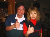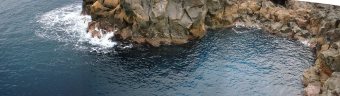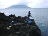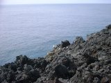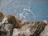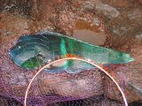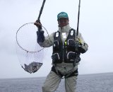 そこで最終的には最初の足元へ戻って底ギリギリで大物に期待する。もうこうなるとメジナ狙いではなくなって、五目狙いの様相である。と、その時しっかりとウキがしもった。しばらくして合わせると大型の重量感が伝わってくる。その直後それは強烈な力で斜め前に走り始めた。特にきつい根があるわけではなく、気を使う事はないが、2号竿はグンニャリの状態。すでに2日で6回のバラシは決してダテではなかったようで、何とかウキまで浮かせる事が出来た。さて問題はこれから更なる突込みがあるかどうかだが、もうすでに相手の体力はかなり消耗していたみたい。 |