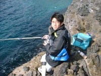 今回は我愚息も一緒で、今日こそは息子にもスリリングな釣りをさせてやりたいと思ったのだが、朝まずめはさっぱりであった。木っ端メジナの姿はチラホラ見えたのだが、その後ショウサイフグに入れ替わり、3人共沈黙。潮も当て潮が続き、唯一釣れたのは、初磯釣りのとちの氏のみで25cmほどの良型ショウサイであった。 |