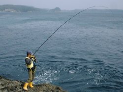 そんな釣りマニアの彼を今回は磯釣りへご案内してみた。車中ではためになるルアー話も弾み、夜明けの地磯へ。この日の気象予報が、午後次第に風強しであったため早朝から出来るところまでやってみようという魂胆だが、祝日ということもあり人では少なめで先客 |