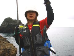 さて今まではあまり潮の効かない所での釣りだったので、今度は潮が流れている釣り座へ移動していただいた。同行している佐山ガイドはすでにその潮でメジナを上げている。この潮は上り潮だが今日は比較的早い流れで、これまた初心者には難しい。これも経験のひとつで海という変化の大きい自然界をいかに身体で感じてそれに対応するかがこの釣りなのである。ここでは数匹の小メジナが釣れたが、その後雨が激しくなり終了となってしまった。
