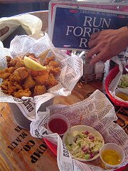 左はメニュー。 右は食事海老とロブスターテイルとマヒマヒのフライセットお勧めでした。映画みたいにバケツにはいったものが多いです。 下はお店の正面フォレスト・ガンプの映画でおなじみのバーバーガンプです。