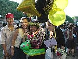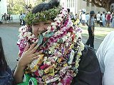 あと、花と手作りのレイとキャンディーレイにまじって、浮き輪をつけてる生徒も目につきました。首に浮き輪をつけてるひと、腰にアヒルの首がついた黄色い浮き輪をつけてるひと。。。などなど。 もぉ、なんでもあり!!!