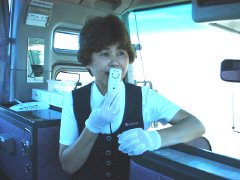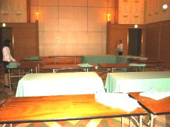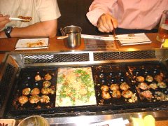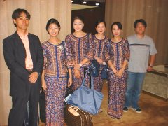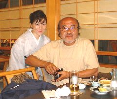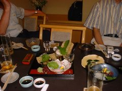 | 関西国際空港でのひととき。全日空国内線チェックインカウンターの真裏にあたるこの店は、地元南大阪から和歌山にかけての新鮮な食材を利用した和食のお店「安愚楽」。0724-56-6500 この日の注文はクジラ肉にオオトロ、ハモ、バッテラなどだったが、いずれも6人には大好評。水ナスのさっぱりとした味には私の故郷の味がして、とても良かった。 全員ゆかた姿の店員さんも皆気さくで、話相手にもなっていただき楽しめました。 |